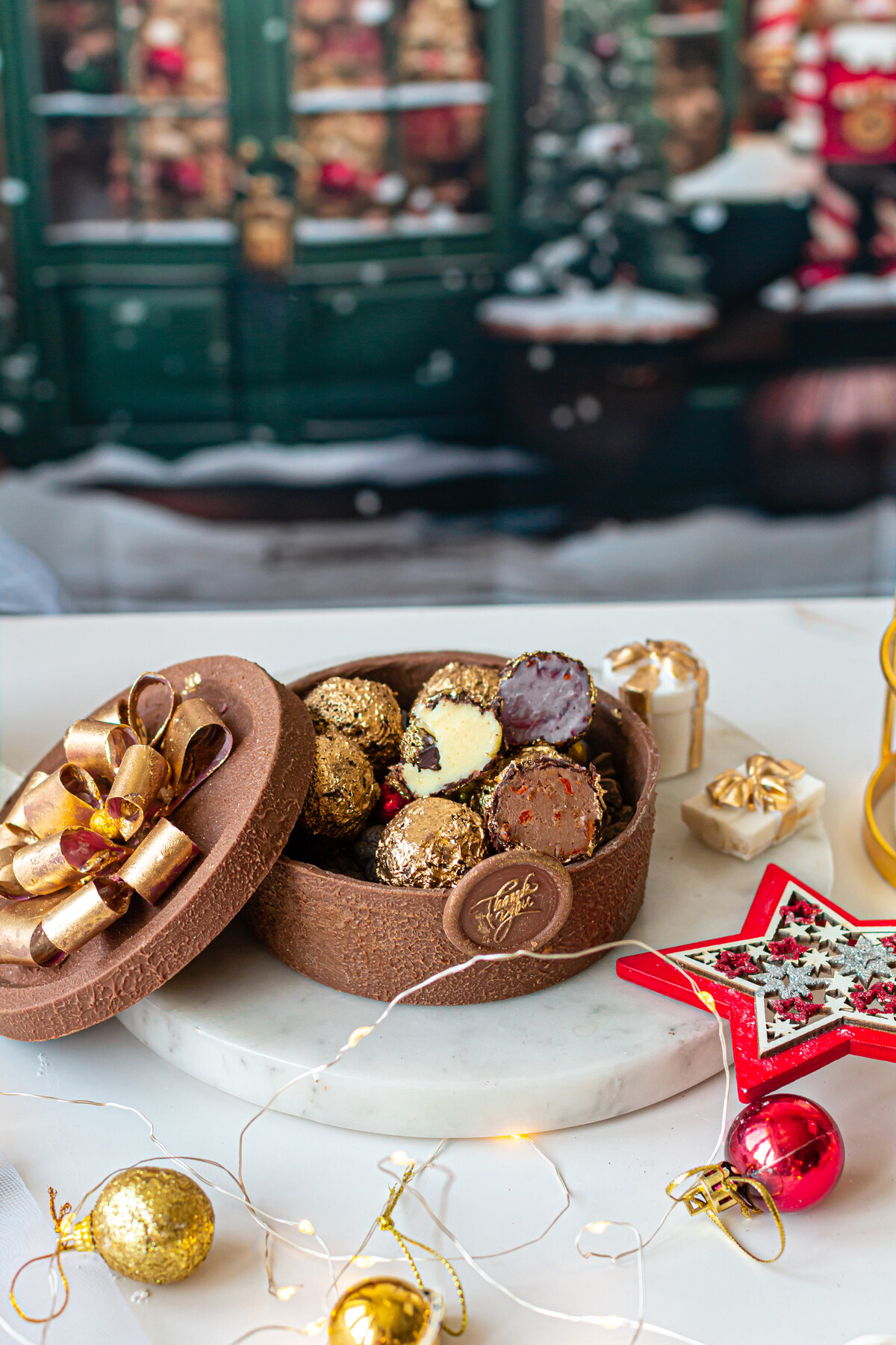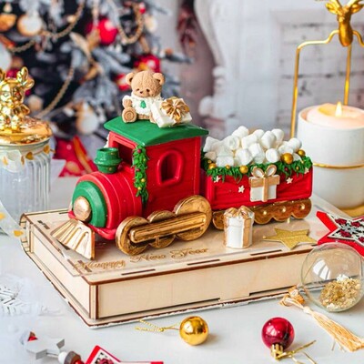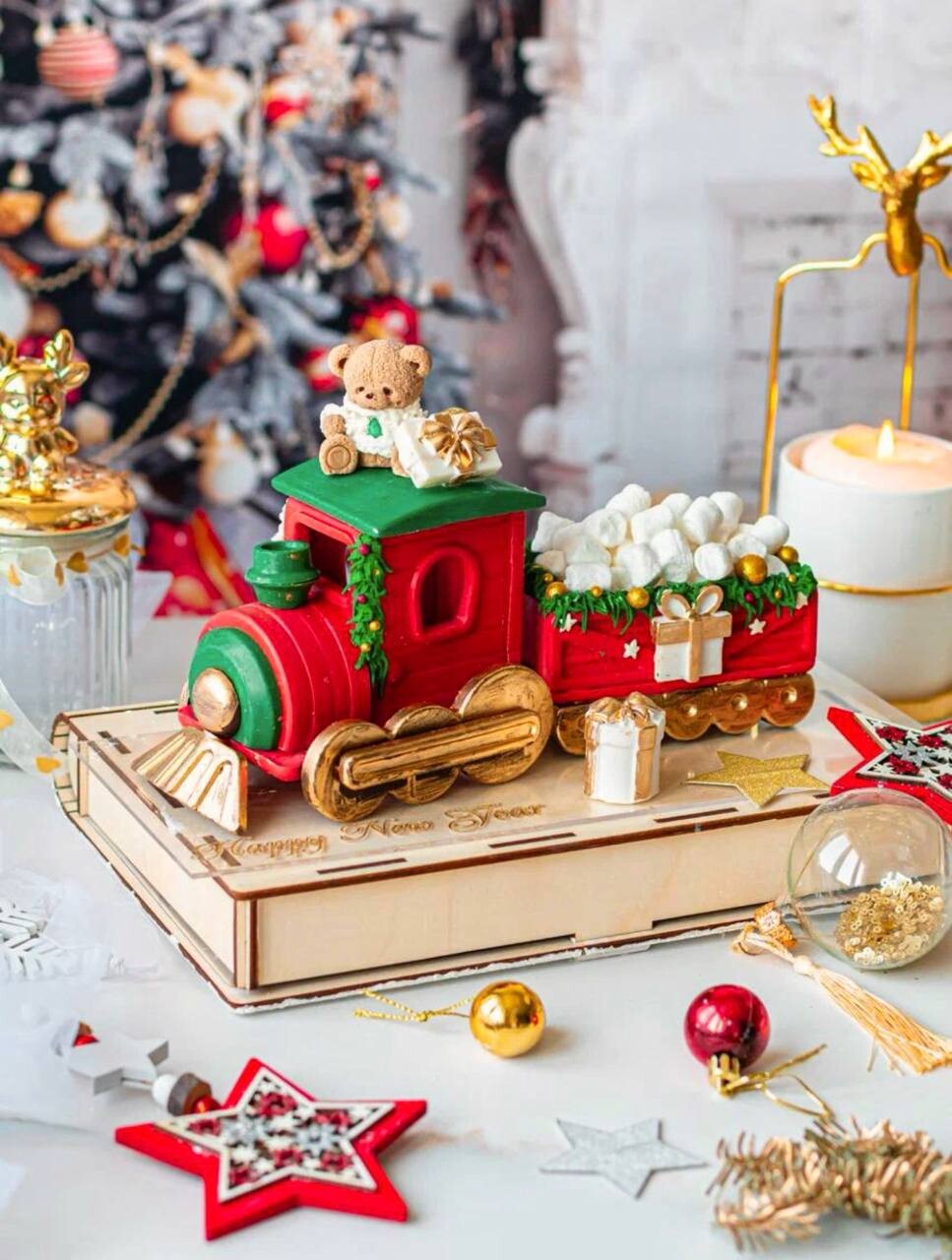 В виде торта и ёлка как шоколадный подарок.