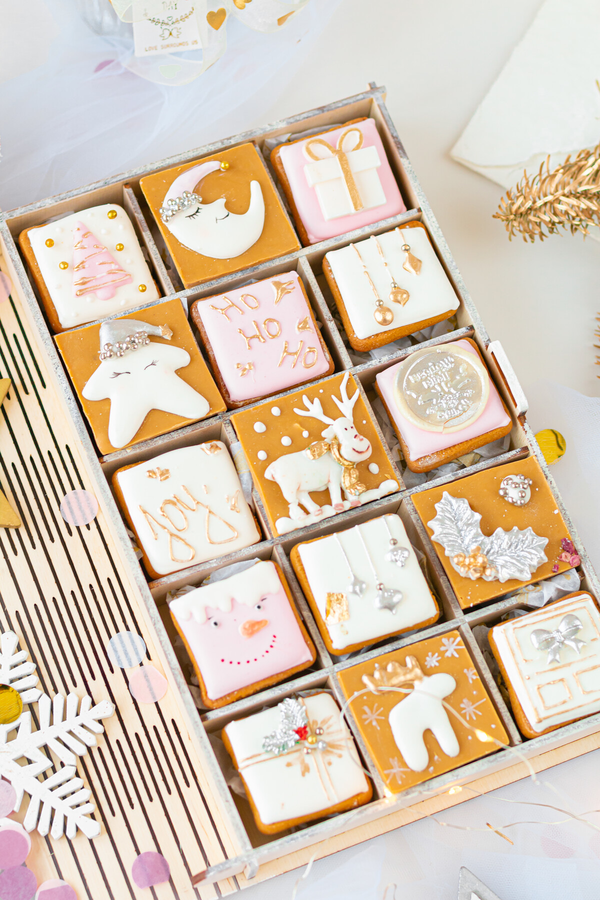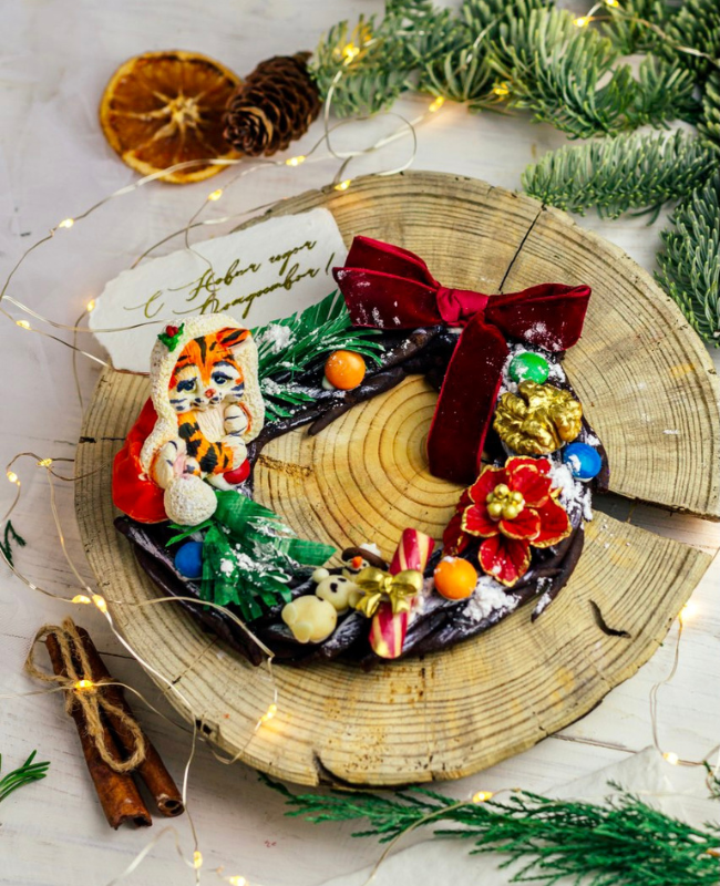 Новогодний венок и полностью съедобный шоколадный тигрёнок.