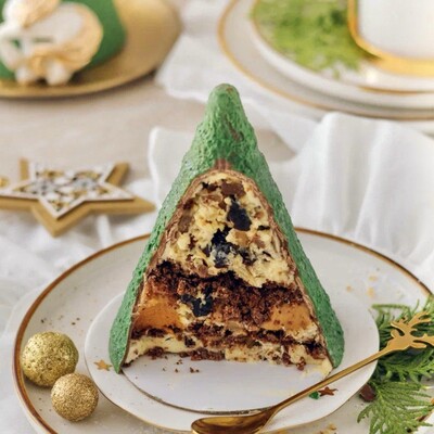 Вкусное сочетание чернослива и грецкого ореха добавляет небольшую терпкость. Бархатный мусс, в меру сладкий и нежный, создаёт гармонию вкуса. И всё это — в тонком шоколадном корпусе в виде новогодней ёлки.Ёлка в виде торта полностью без выпечки.